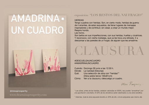 Puedes ver los cuadros con “heridas” aquí. Si quieres amadrinarlo, puedes hacerlo por una aportación voluntaria. La mitad de los donativos los destinaré a una acción benéfica, coherente con los valores de Miss Prosperity.