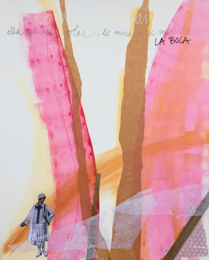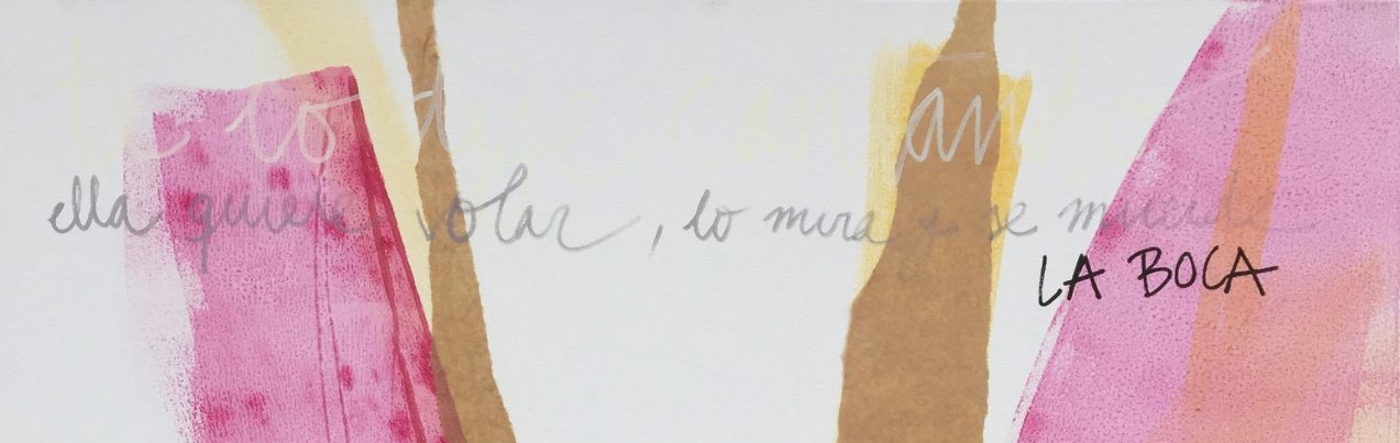 Mi obra “Ella quiere volar” está realizada en técnica mixta sobre lienzo y forma parte del discurso artístico que llevo desarrollando durante el último año, en el que mezclo pintura, escritura y collage.